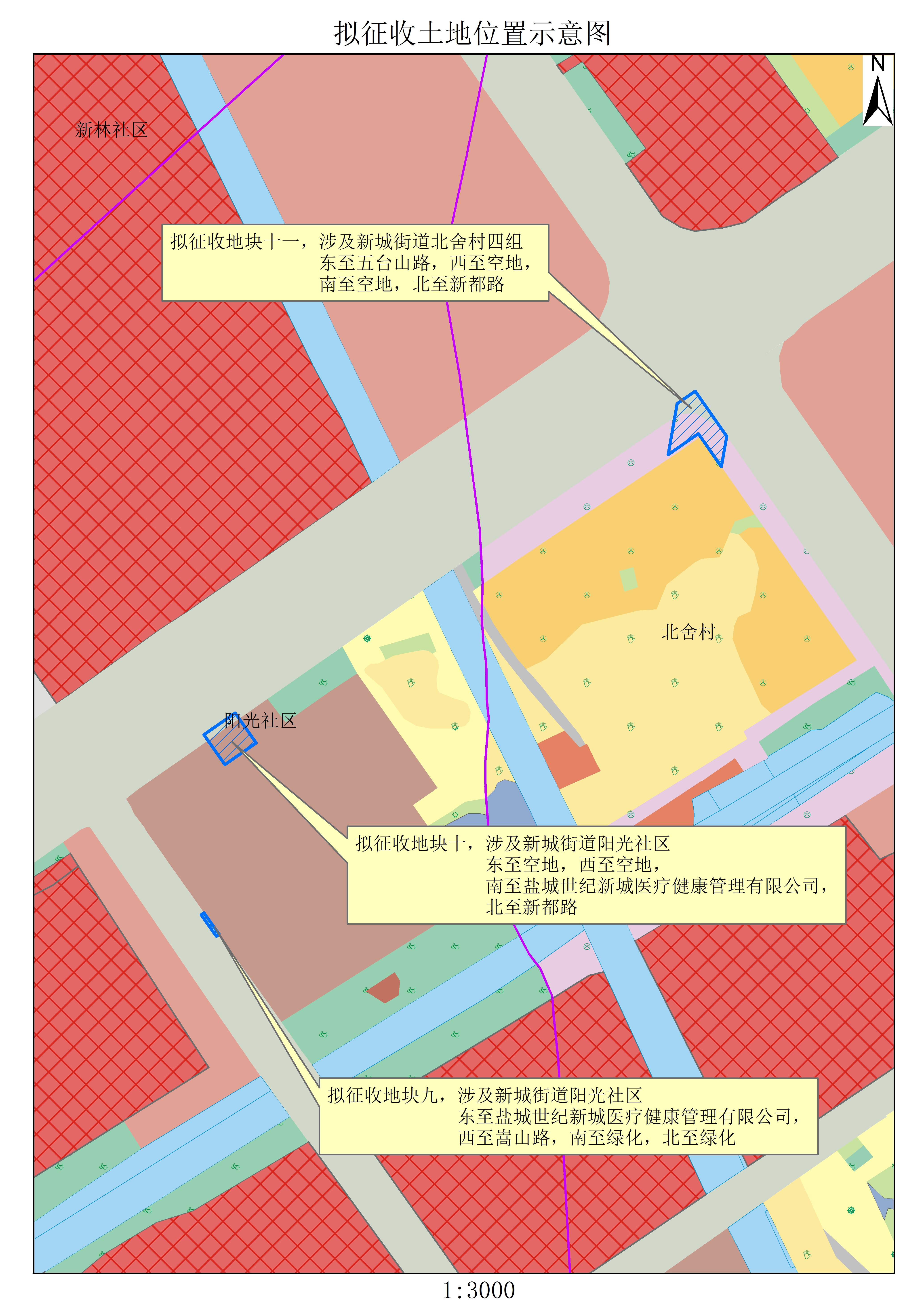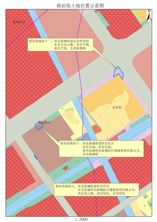 位置范围:东至空地,南至盐城世纪新城医疗健康管理有限公司,西至空地,北至新都路。拟征收土地位置详见附图。