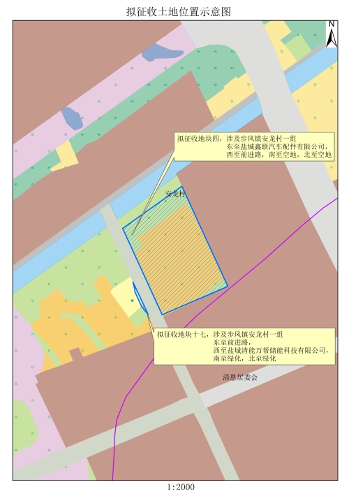 位置范围:东至前进路,南至绿化,西至盐城清能万帮储能科技有限公司,北至绿化。拟征收土地位置详见附图。